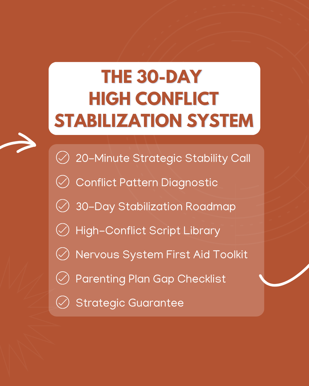 It begins with a 20-minute Strategic Stability Call where we identify what is structurally driving your conflict — not what feels loud, but what is actually maintaining the cycle. From there, you receive a focused Conflict Pattern Diagnostic that shows you your primary escalation trigger and the specific stabilization priority.